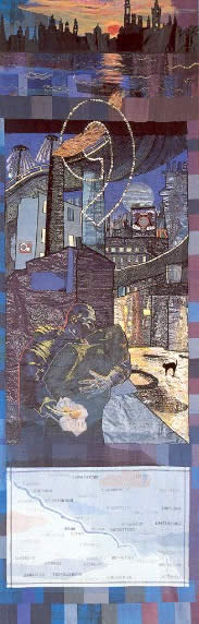 the city. At the top a stylised skyline is thrown into stark relief